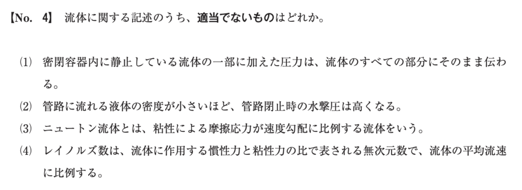 問題:管路に流れる液体の密度が小さいほど、管路閉止時の水撃圧は高くなる。