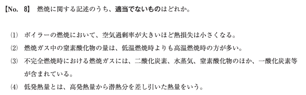 問題:ボイラーの燃焼において、空気過剰率が大きいほど熱損失は小さくなる。