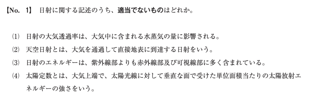 問題:天空日射とは、大気を通過して直接地表に到達する日射をいう。