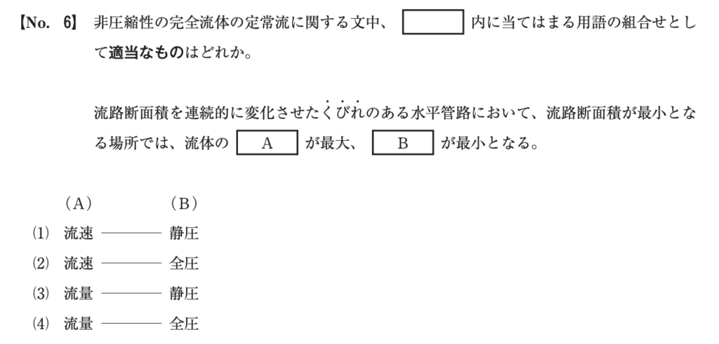 管内の全圧はどこも同じであり、全圧=静圧+動圧です。水の勢いが速くなるということは動圧が大きくなるため、(B)は「静圧」が最小になります。