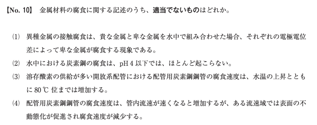問題:溶存酸素の供給が多い開放系配管における配管用炭素鋼鋼管の腐食速度は、水温の上昇とともに80℃位までは増加する。