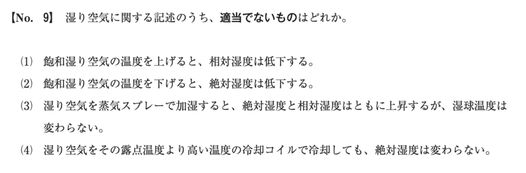 問題:湿り空気をその露点温度より高い温度の冷却コイルで冷却しても、絶対湿度は変わらない。