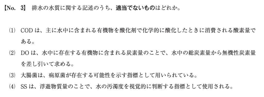 問題:DOは、水中に存在する有機物に含まれる炭素量のことで、水中の総炭素量から無機性炭素量を差し引いて求める。