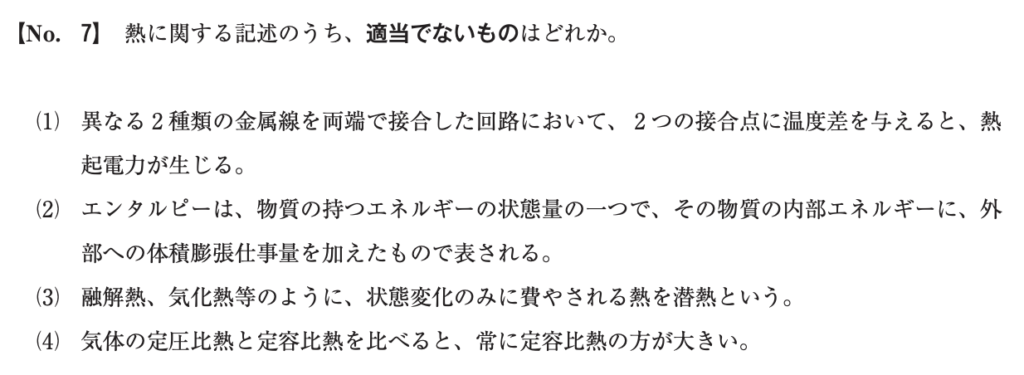 問題:エンタルピーは、物質の持つエネルギーの状態量の一つで、その物質の内部エネルギーに、外部への体積膨張仕事量を加えたもので表される。