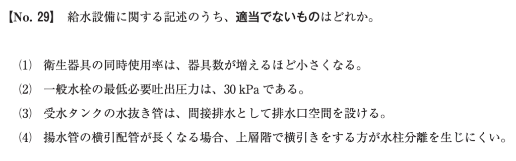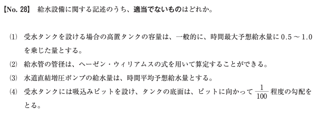 問題:給水量を算定する場合、1人1日当たりの単位給水量は、事務所の方が集合住宅より多い。