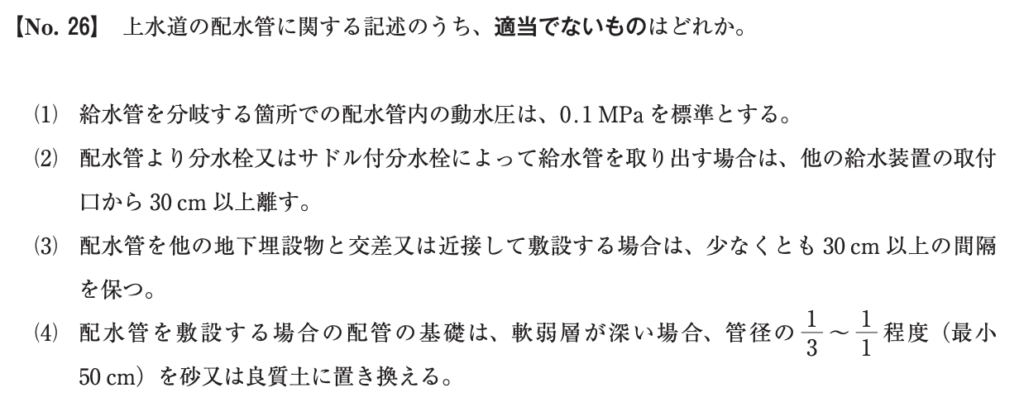 問題:配水管を敷設する場合の配管の基礎は、軟弱層が深い場合、管径の1/3〜1/1程度(最小50cm)を砂又は良質土に置き換える。