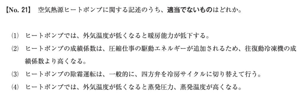 問題:ヒートポンプでは、外気温度が低くなると蒸発圧力、蒸発温度が高くなる。