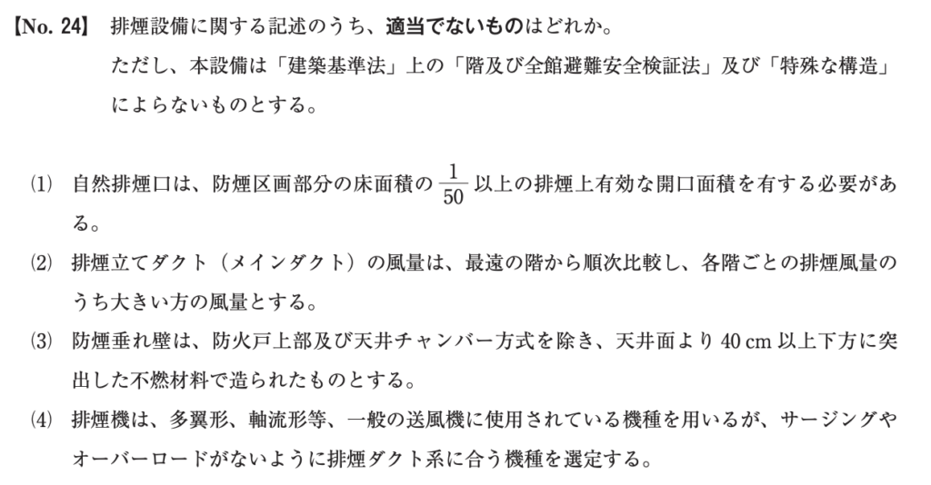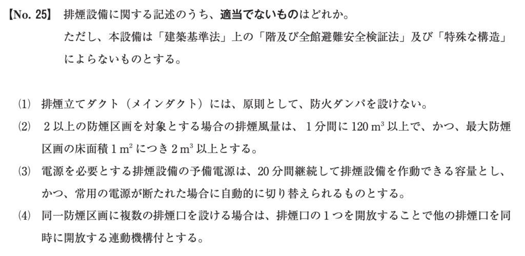 問題:2以上の防煙区画を対象とする場合の排煙風量は、1分間に120㎥以上で、かつ、最大防煙区画の床面積1㎡につき2㎥以上とする。