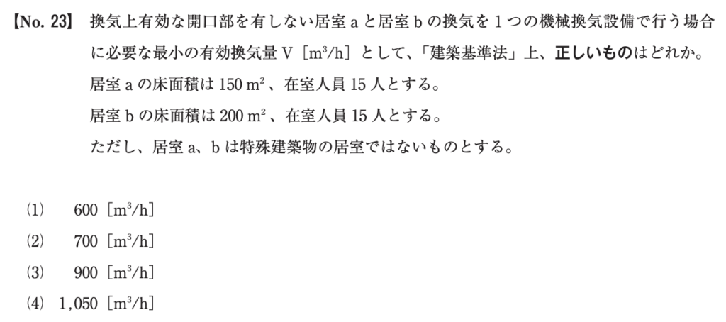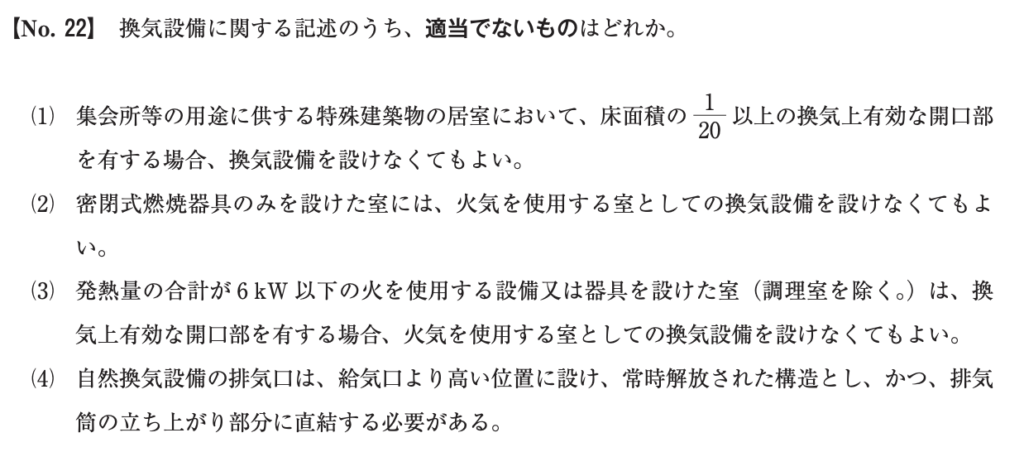 問題:集会所等の用途に供する特殊建築物の居室において、床面積の1/20以上の換気上有効な開口部を有する場合、換気設備を設けなくてもよい。