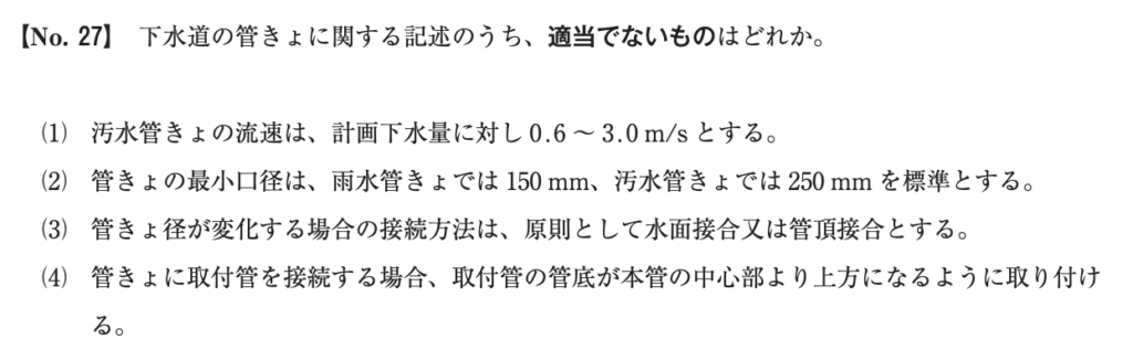 問題:分流式の下水道において、管きょ内の必要最小流速は、雨水管きょに比べて、汚水管きょの方が大きい。