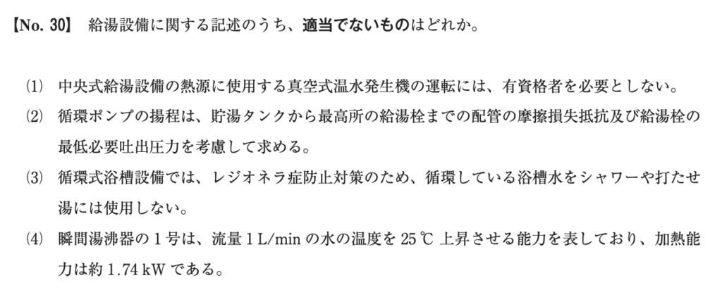 問題:貯湯タンクには、加熱による水の膨張で装置全体の圧力を以上に上昇させないため、逃し管又は安全弁(逃し弁)を設ける。