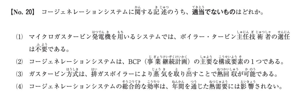 問題:コージェネレーションシステムは、BCP(事業継続計画)の主要な構成要素の1つである。