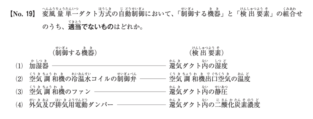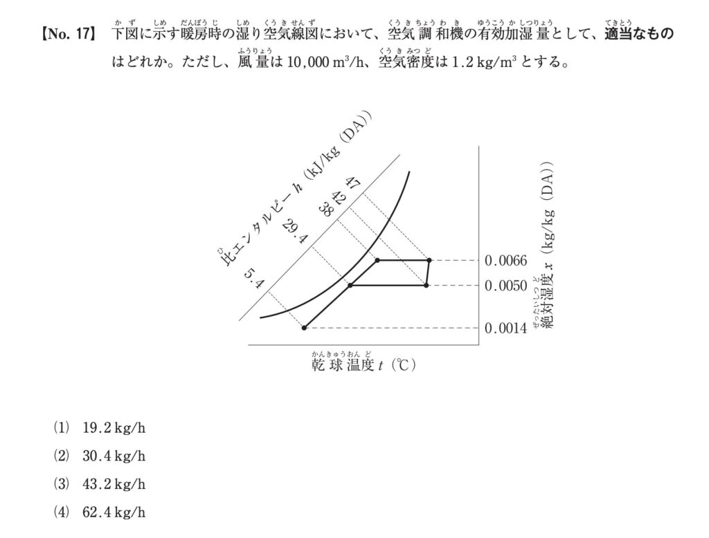 問題:全熱交換器は、建物からの排気と導入外気を熱交換させるもので、導入外気の温湿度を室内空気の温湿度に近づけることができる。