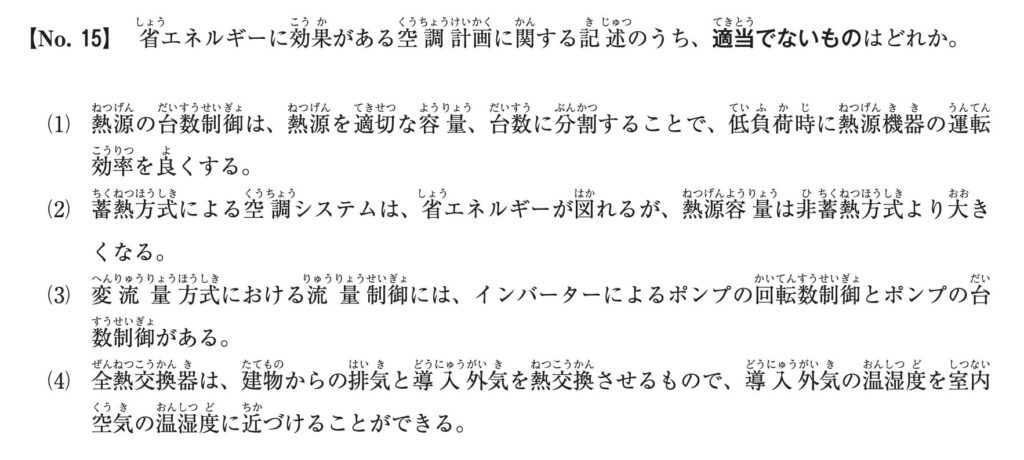 問題:蓄熱方式による空調システムは、省エネルギーが図れるが、熱源容量は非蓄熱方式より大きくなる。