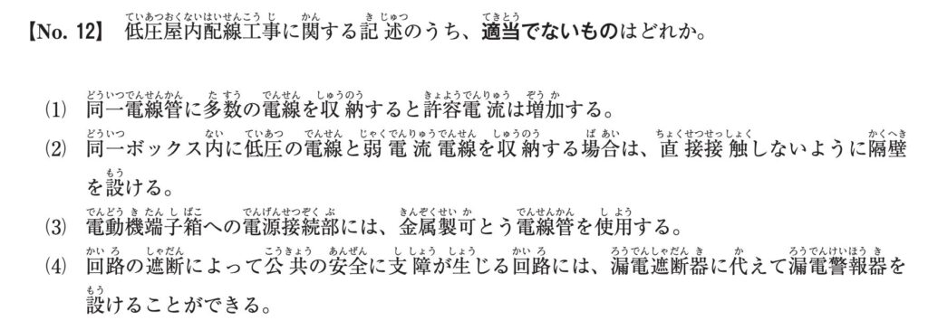 問題:同一電線管に多数の電線を収納すると許容電流は増加する。
