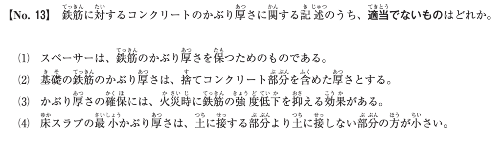 問題:かぶり厚さの確保には、火災時に鉄筋の強度低下を抑える効果がある。