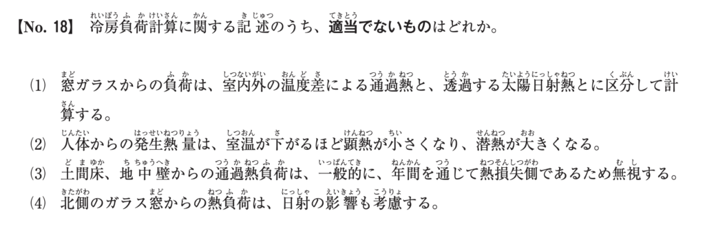 問題:北側のガラス窓からの熱負荷は、日射の影響も考慮する。