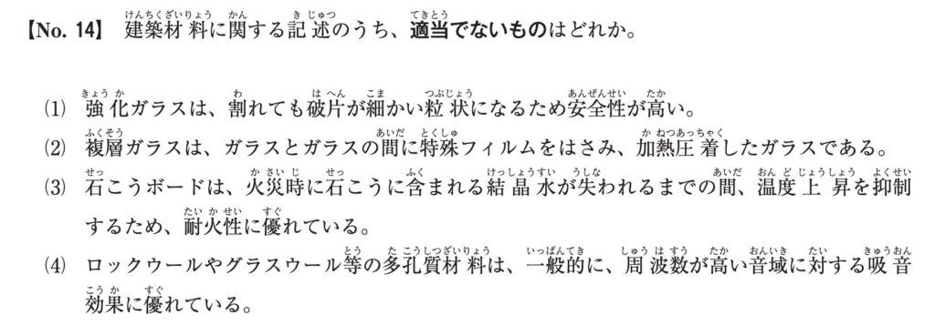問題:石こうボードは、火災時に石こうに含まれる結晶水が失われるまでの間、温度上昇を抑制するため、耐火性に優れている。