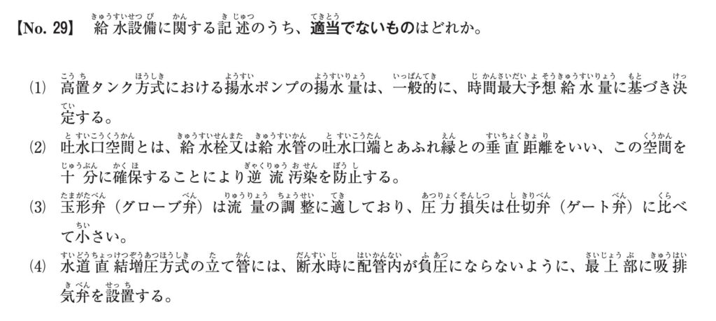 問題:水道直結増圧方式の立て管には、断水時に配管内が負圧にならないように、最上部に吸排気弁を設置する。