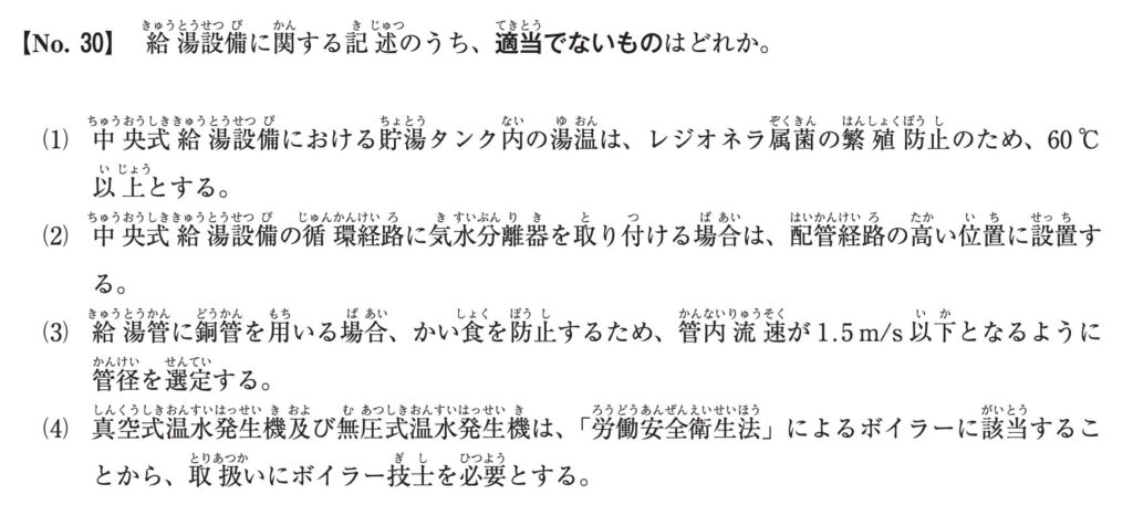 問題:中央式給湯設備における貯湯タンク内の湯温は、レジオネラ属菌の繁殖防止のため、60℃以上とする。
