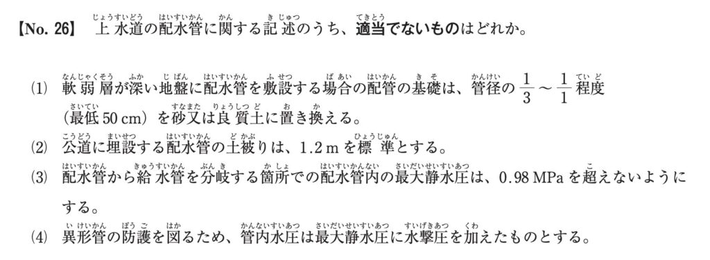 問題:軟弱層が深い地盤に配水管を敷設する場合の配管の基礎は、管径の1/3〜1/1程度(最低50cm)を砂又は良質土に置き換える。