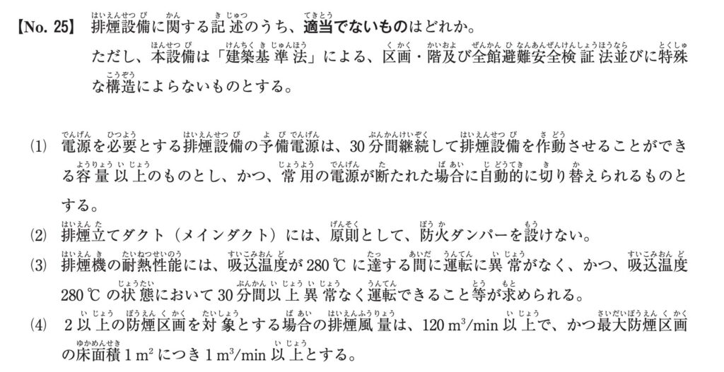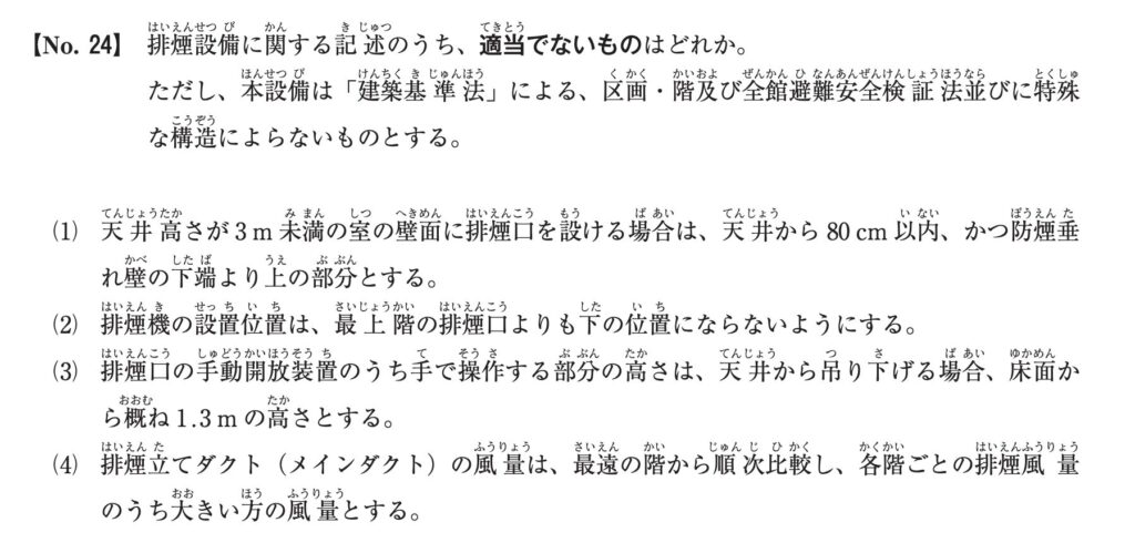 問題:排煙機の設置位置は、最上階の排煙口よりも下の位置にならないようにする。
