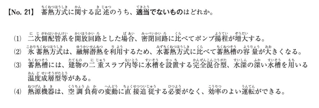 問題:氷蓄熱方式は、融解潜熱を利用するため、水蓄熱方式に比べて蓄熱槽の容量が大きくなる。