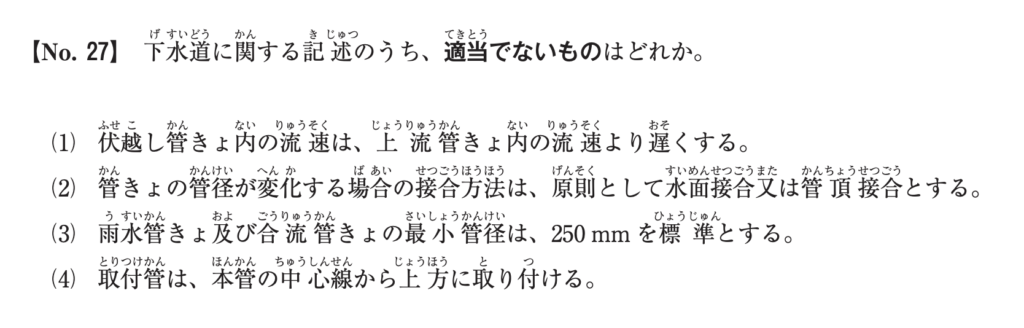 問題:管きょの管径が変化する場合の接合方法は、原則として水面接合又は管頂接合とする。