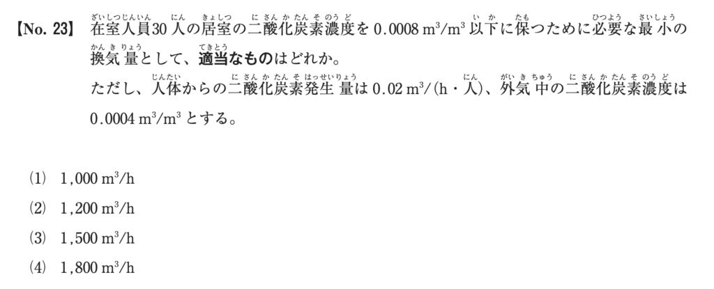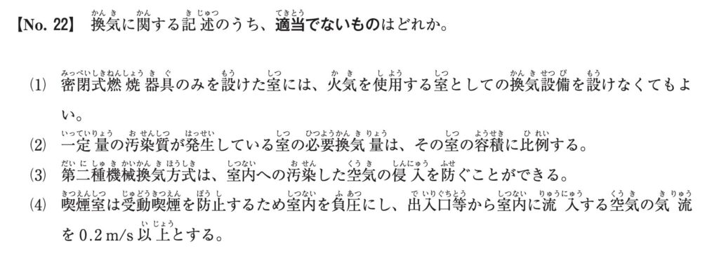 問題:喫煙室は受動喫煙を防止するため室内を負圧にし、出入口等から室内に流入する空気の気流を0.2m/s以上とする。