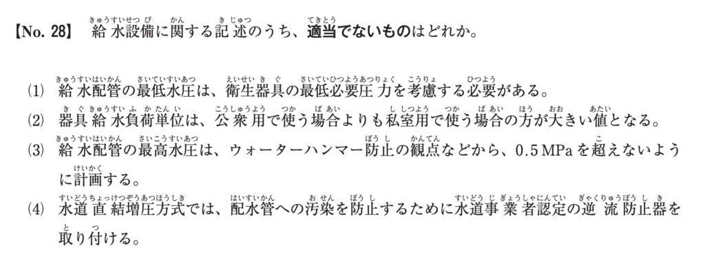 問題:給水配管の最高水圧は、ウォーターハンマー防止の観点などから、0.5MPaを超えないように計画する。